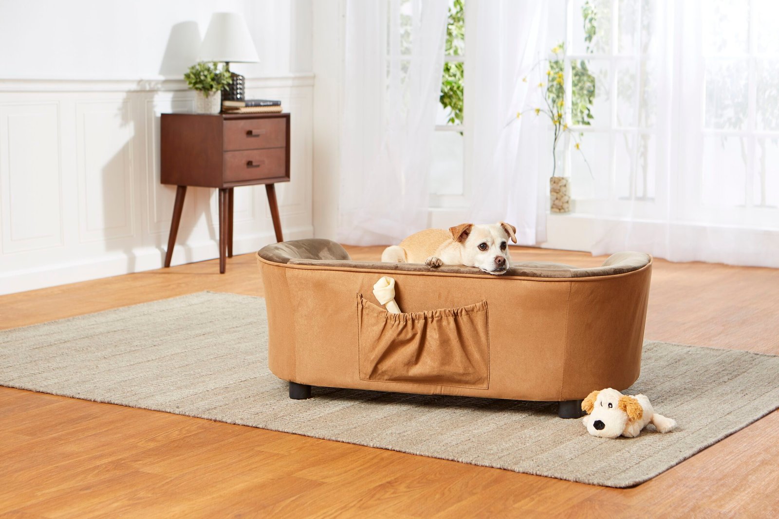Elliot, a 20 pound Lab Mix gets comfy in the soft and plush