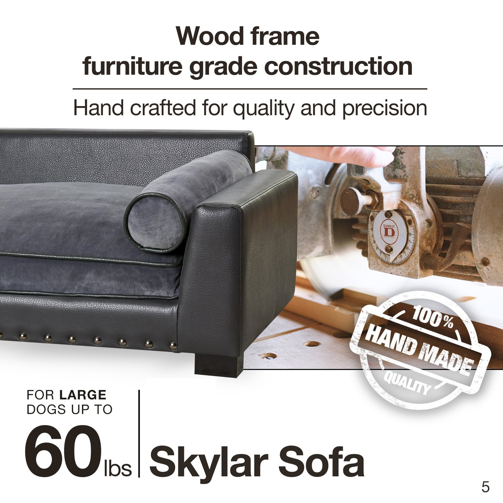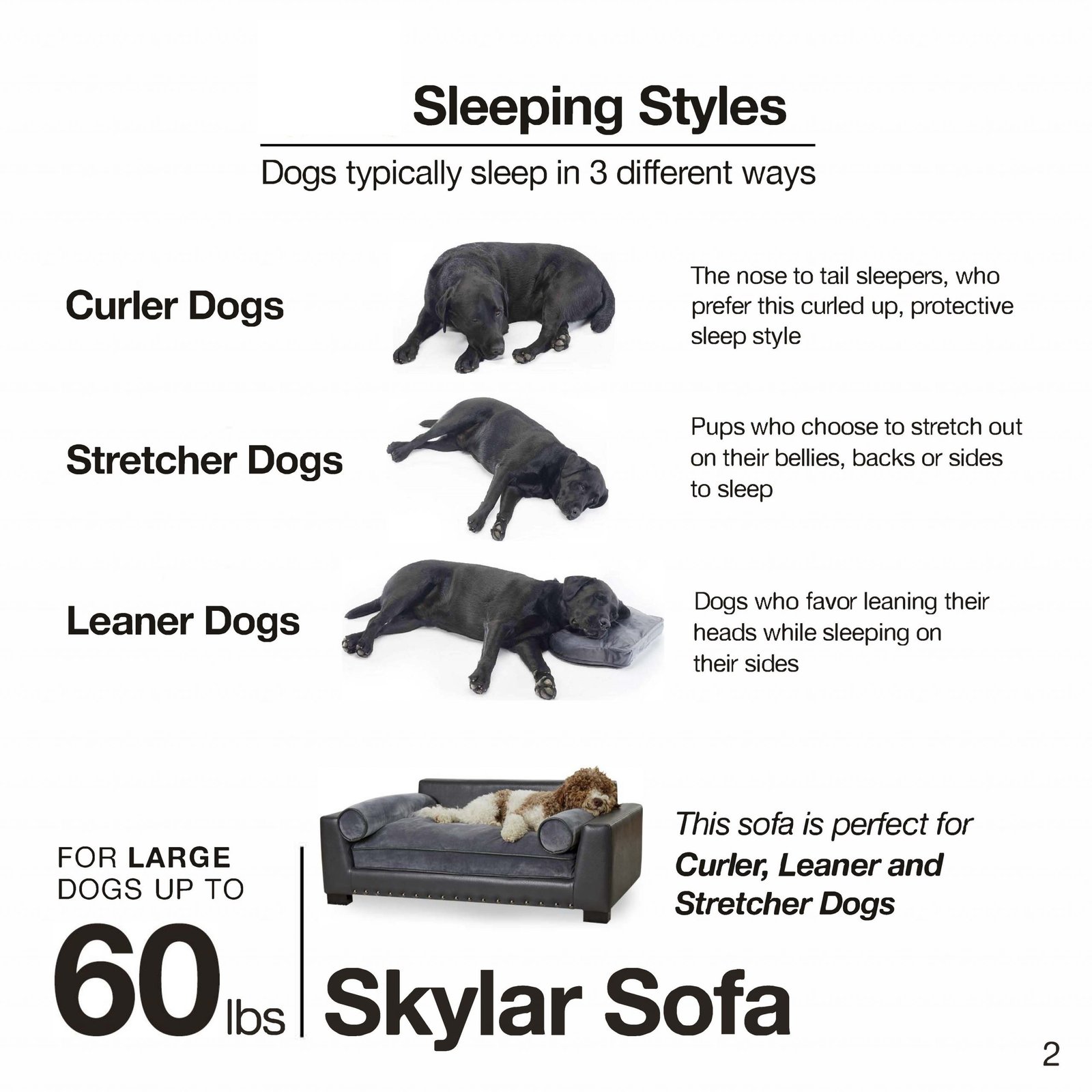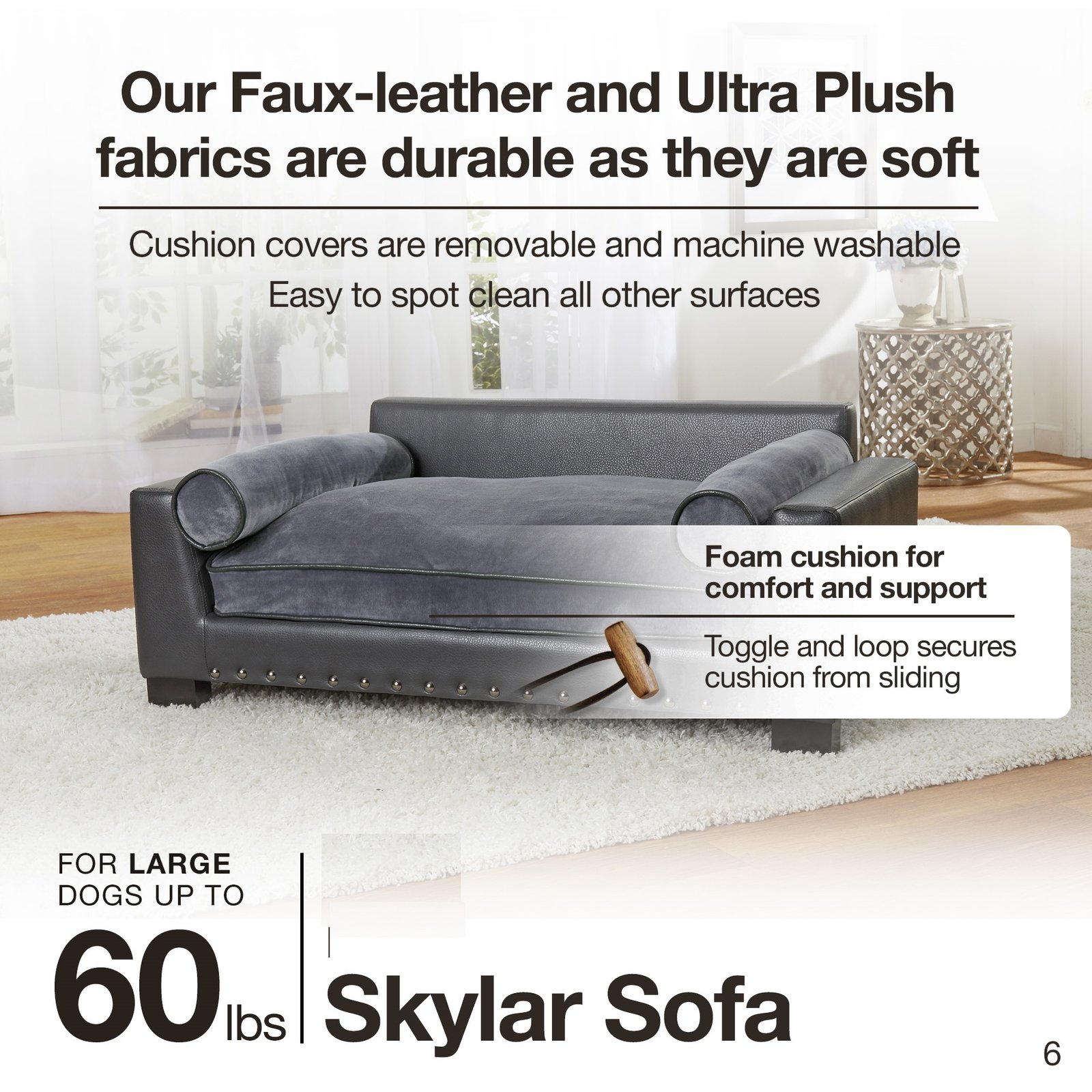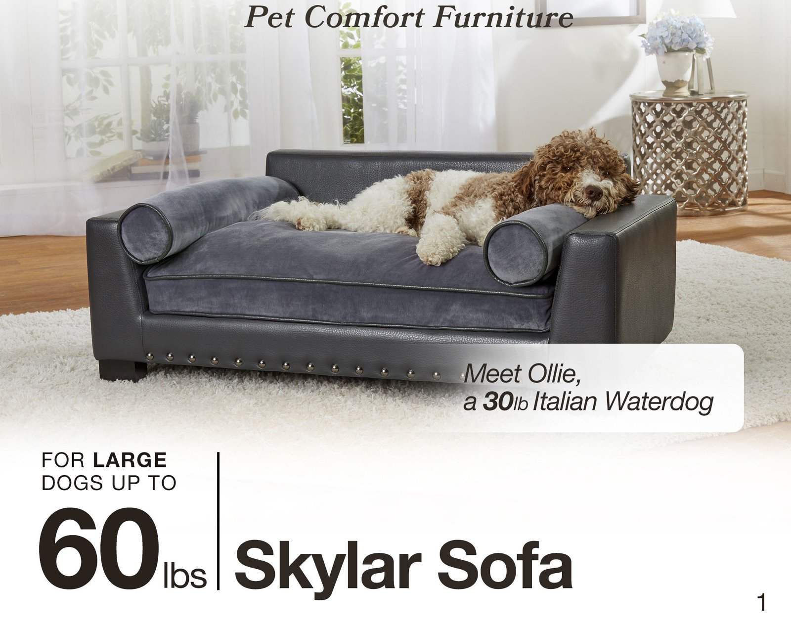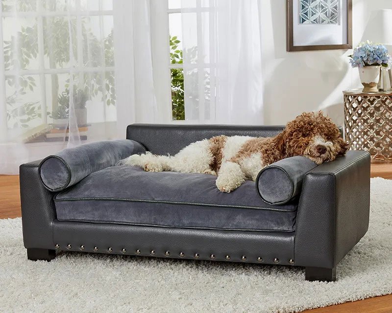 Ollie, a 30 pound Italian Waterdog, is lounging on the Skylar Sofa. This modern lounge features dark grey, pebble grain, faux-leather with nailheads. Its Ultra-Plush cushion and two bolster pillows for lounging make it super comfortable for leaners and stretchers.