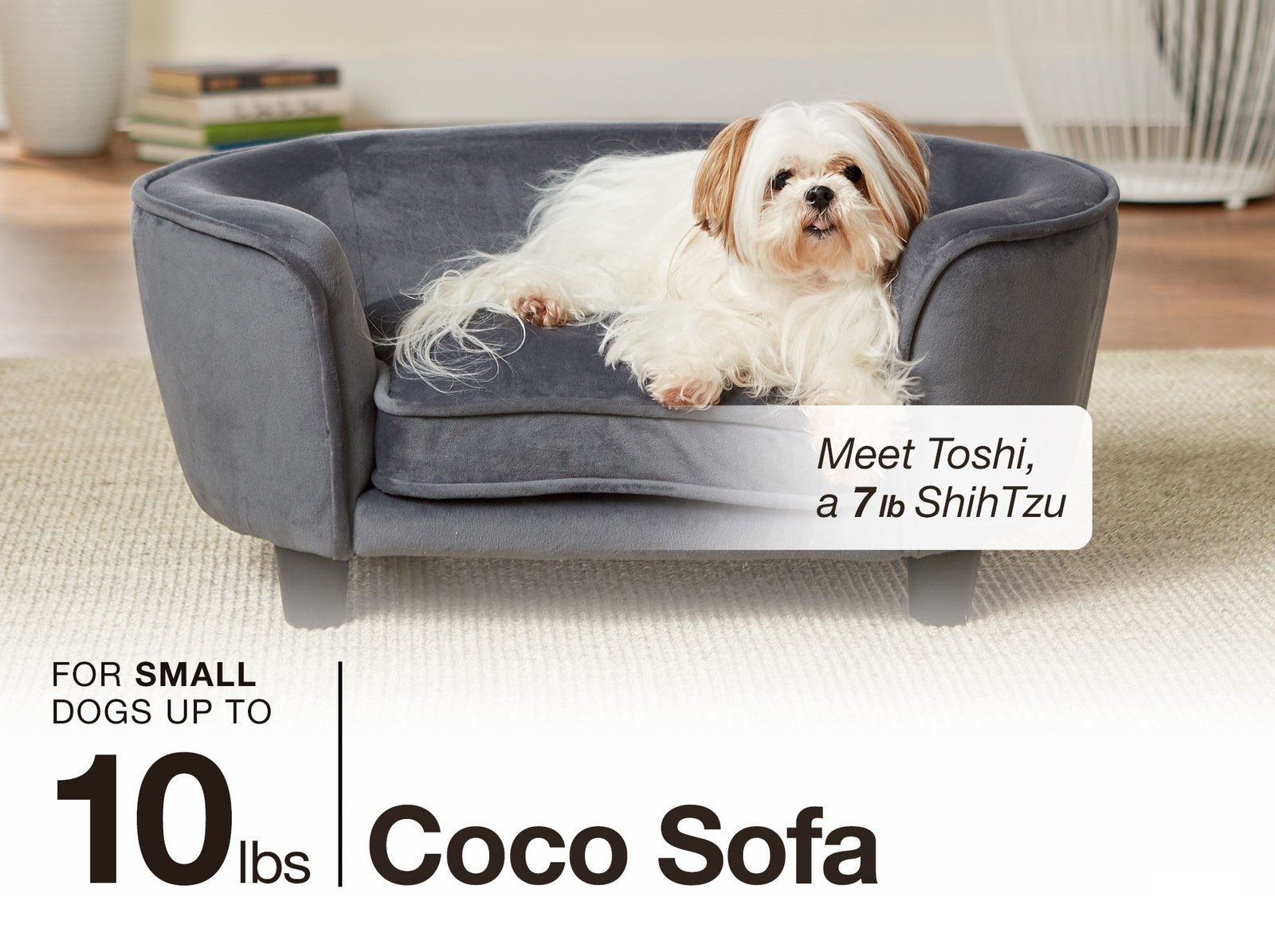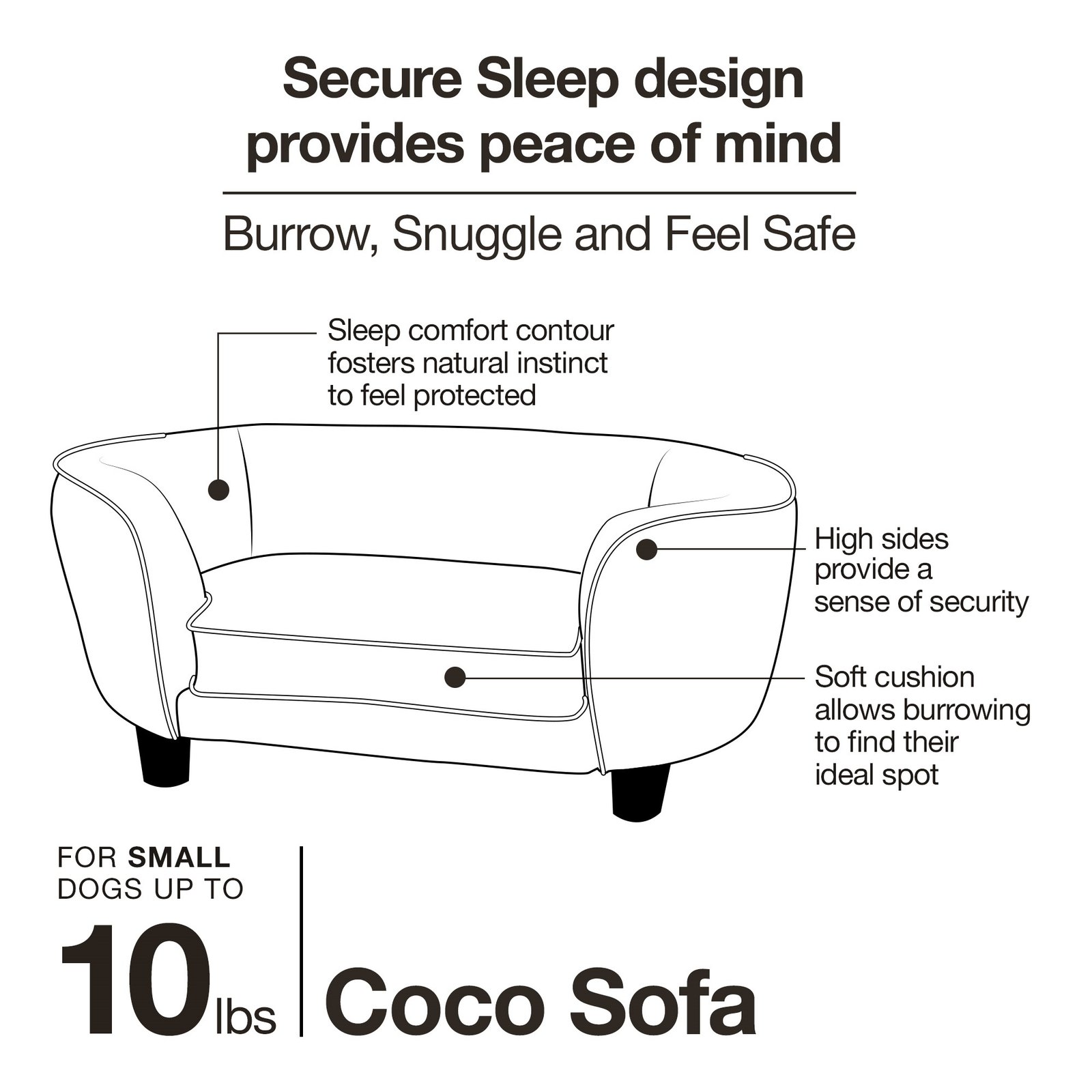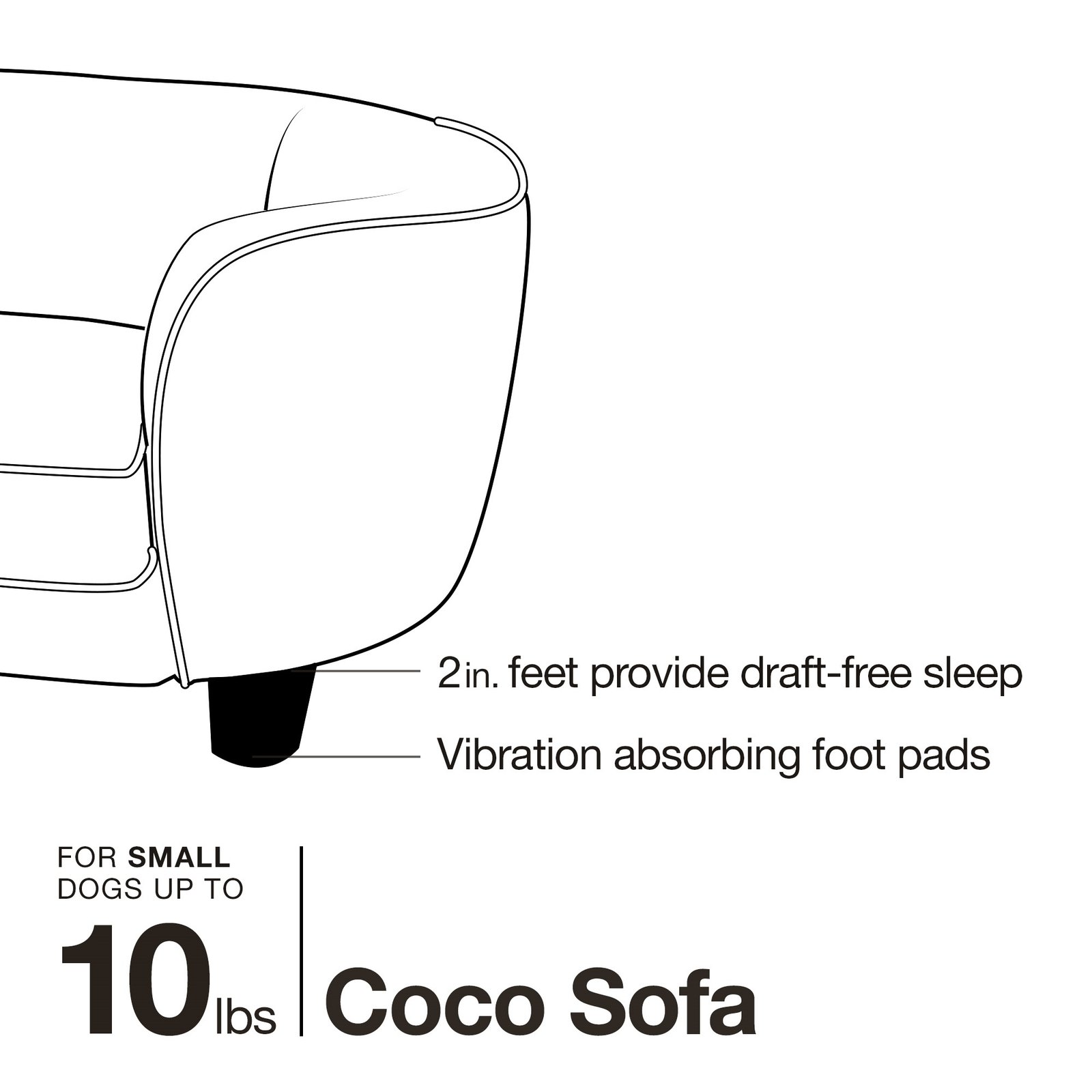 Simba, an 8 pound poodle is sure he has found his favorite place in the house on this Coco Sofa. Covered in the softest, velvet in a neutral Stone color, the cushion cover is removable and washable. The curve of the back of the Coco ensures that the dog feels secure and protected while resting. It is elevated on 2” legs for a draft-free sleep.