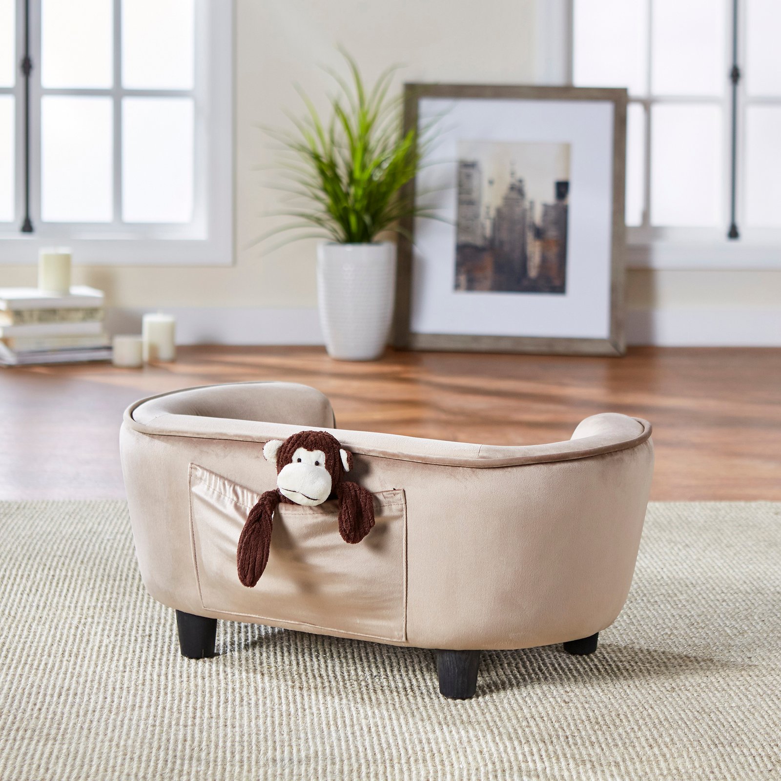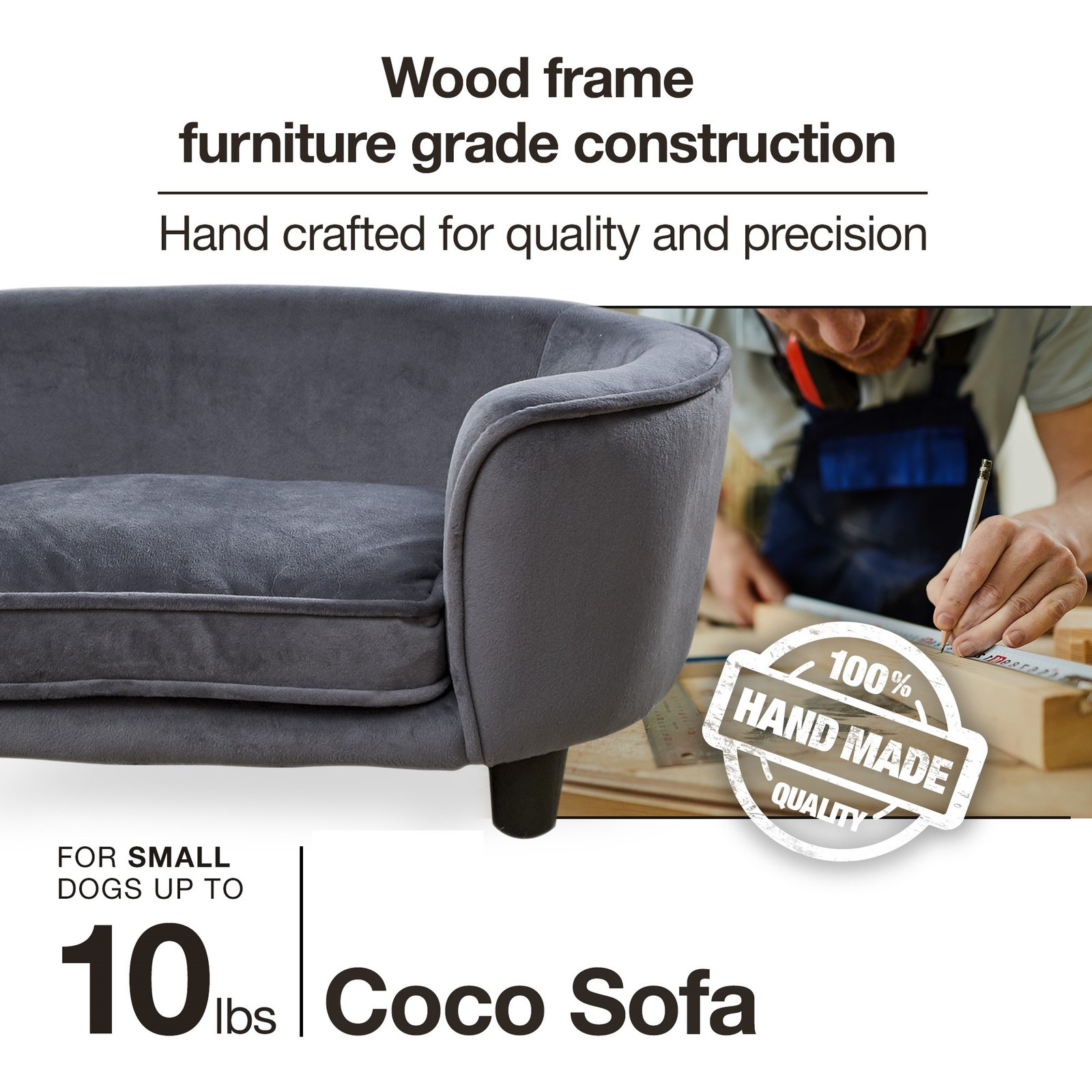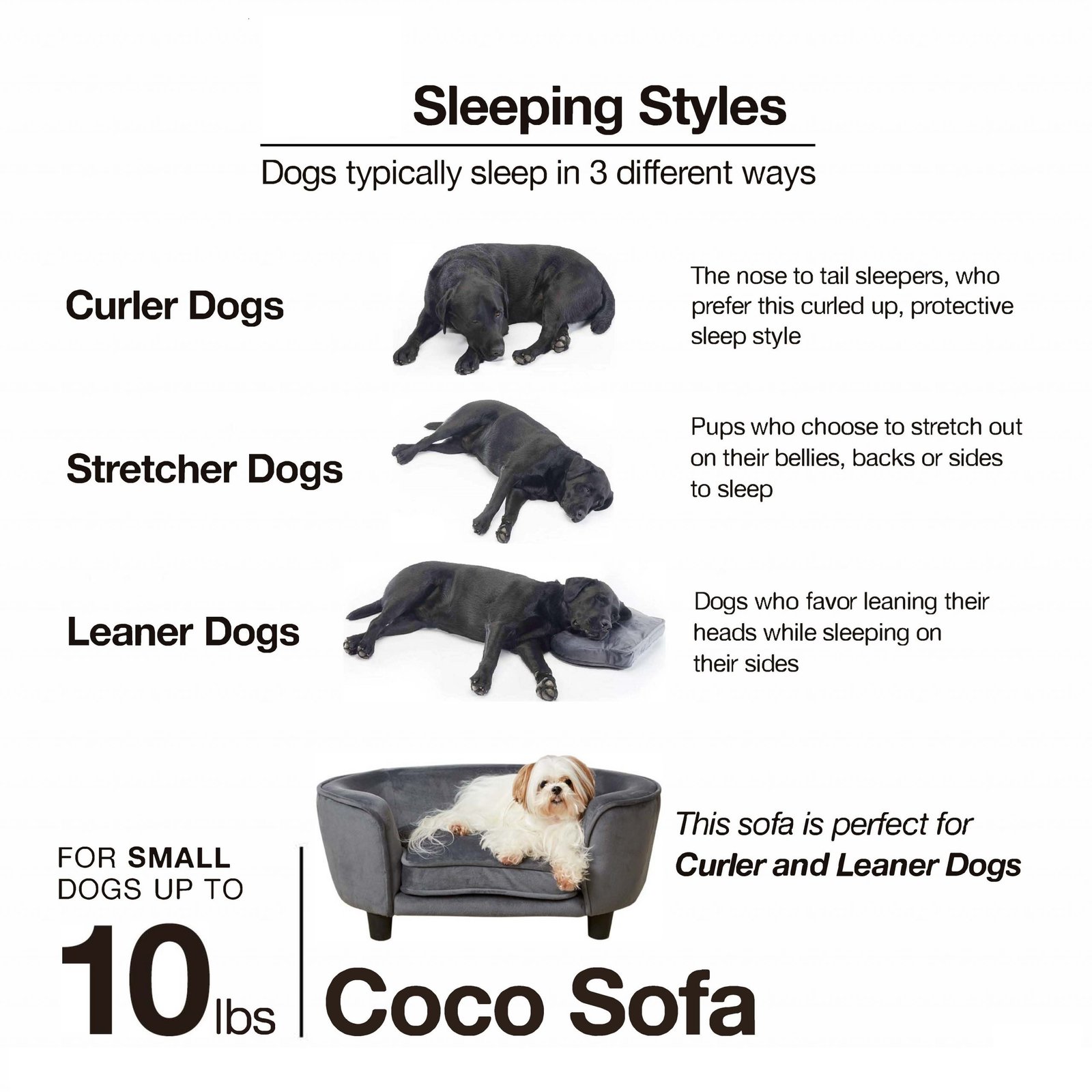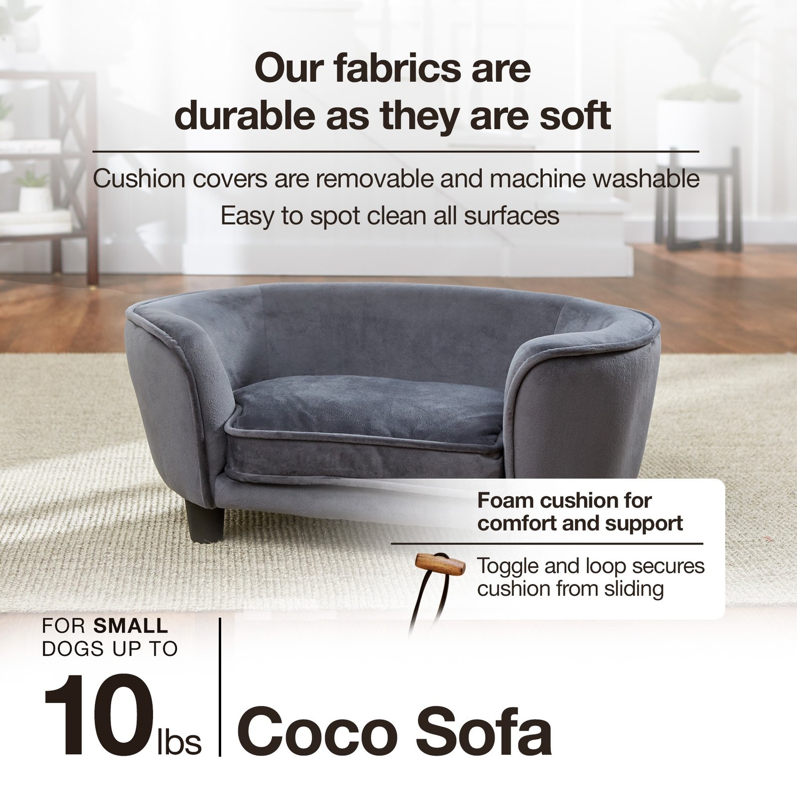 Simba, an 8 pound poodle is sure he has found his favorite place in the house on this Coco Sofa. Covered in the softest, velvet in a neutral Stone color, the cushion cover is removable and washable. The curve of the back of the Coco ensures that the dog feels secure and protected while resting. It is elevated on 2” legs for a draft-free sleep.