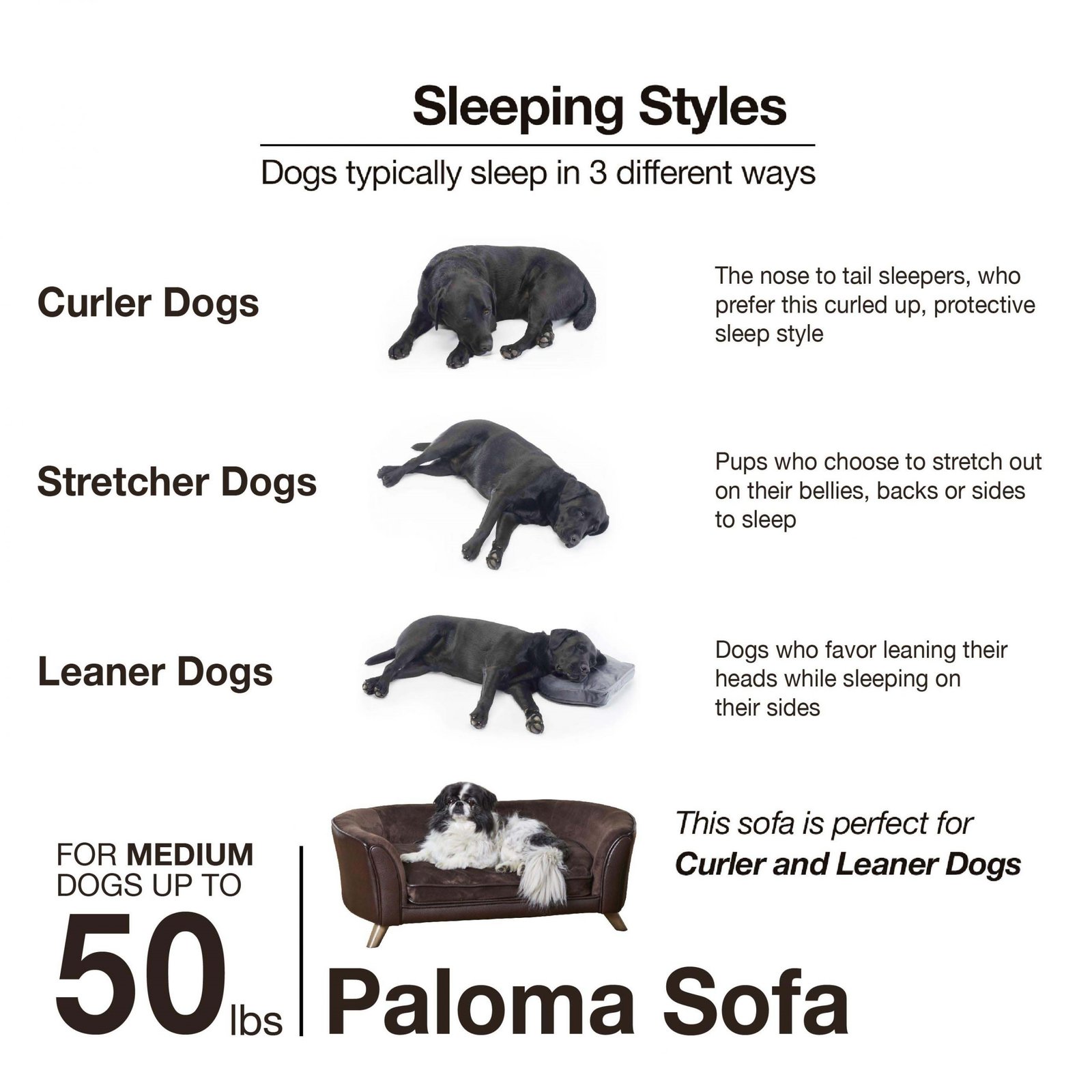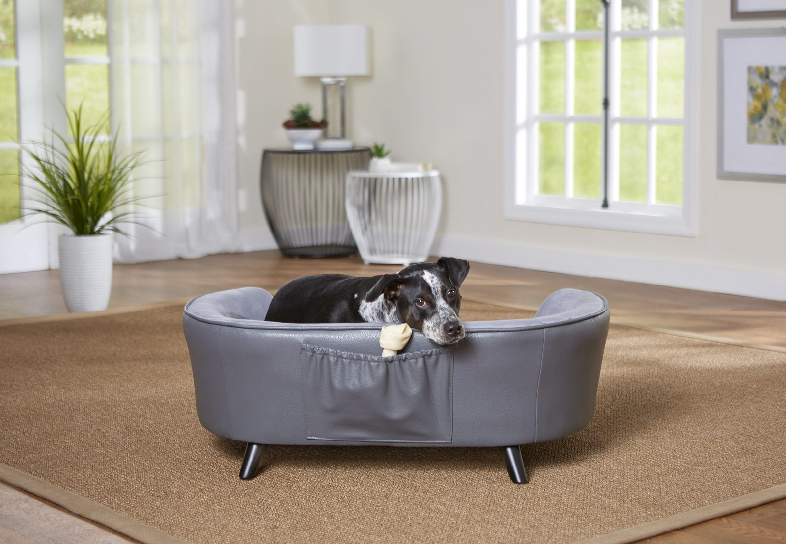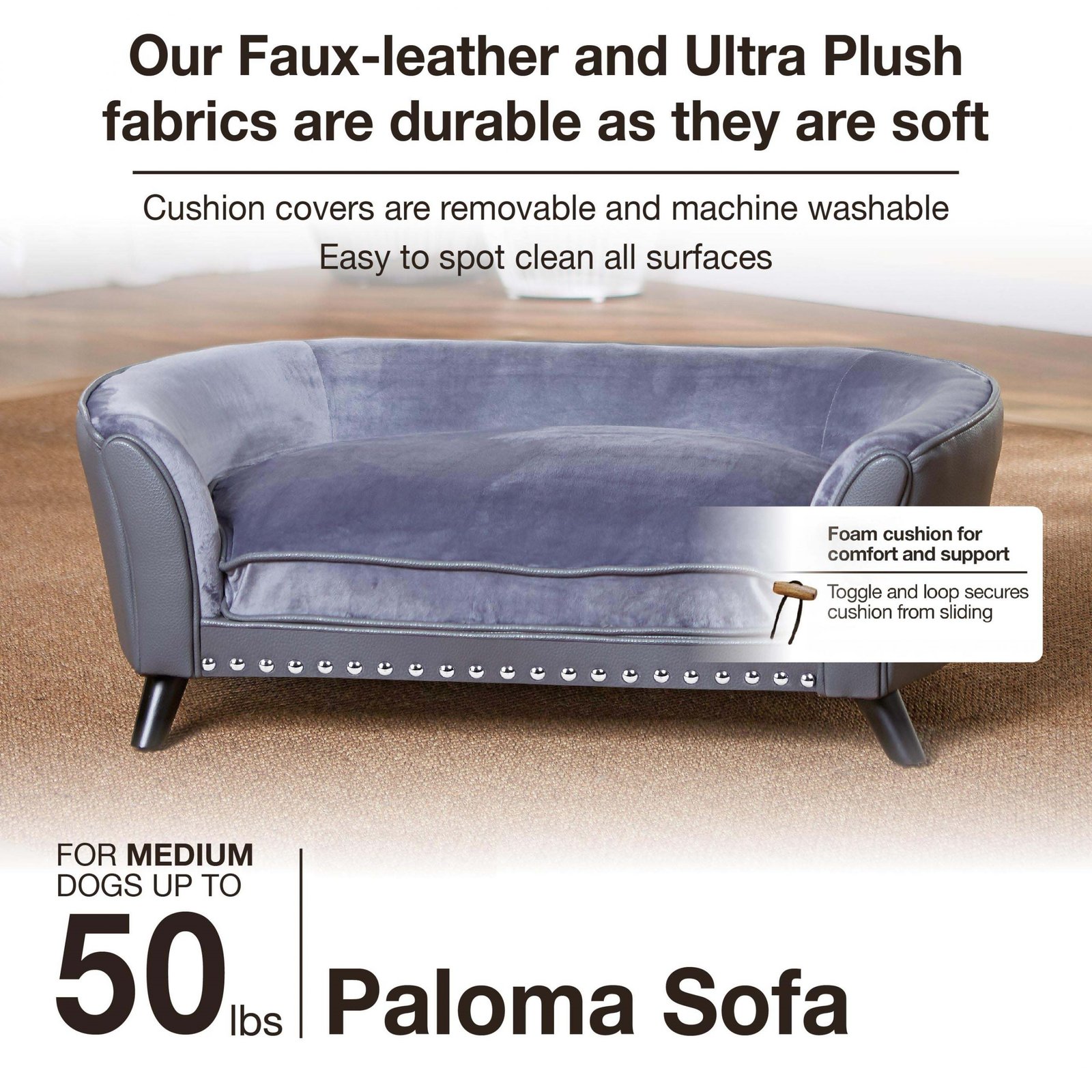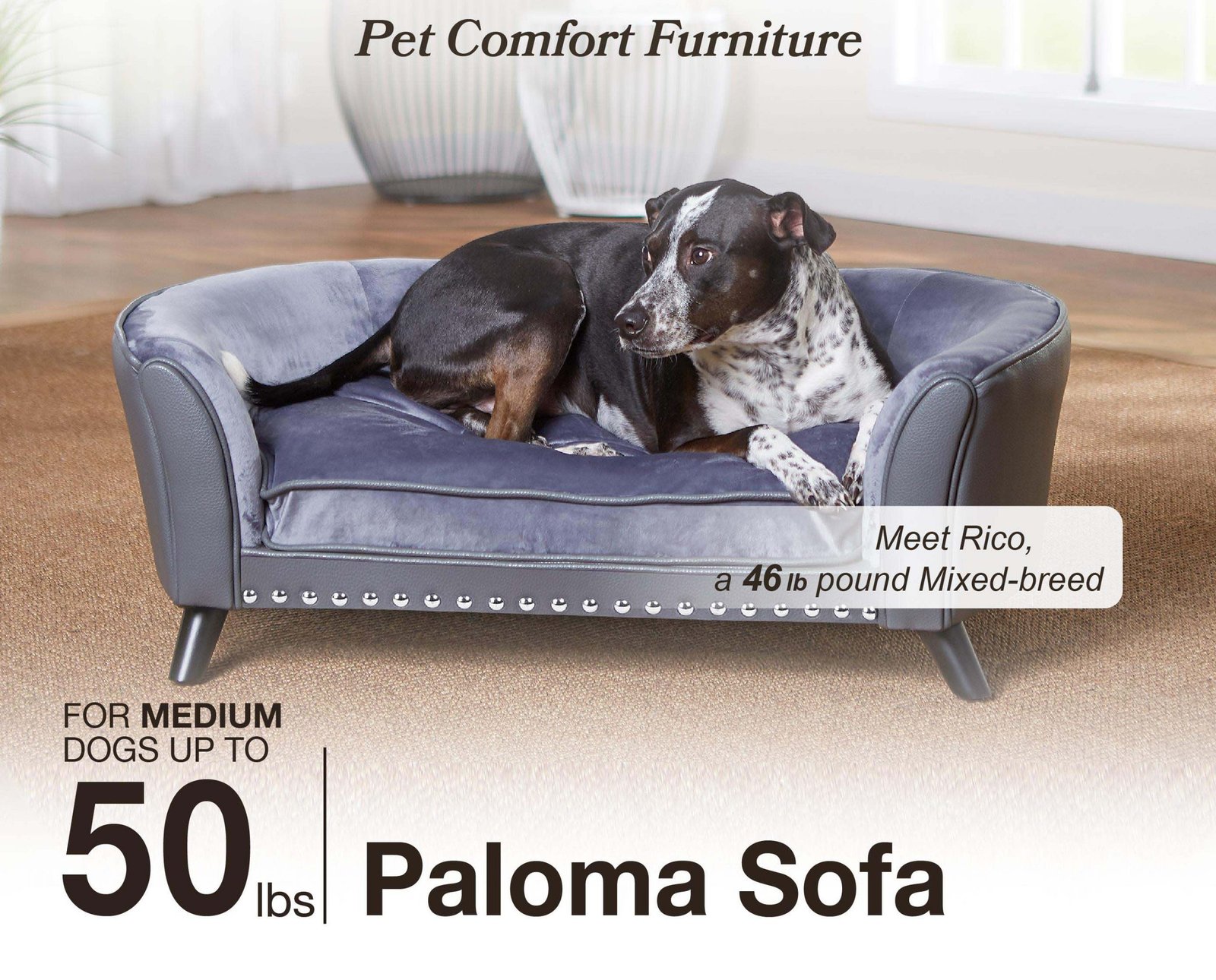 Here is Rico, a 46 pound Mixed-breed who has found his place right here on the Paloma Sofa. This gorgeous grey pebble-grain faux-leather and velvet combo is perfectly paired with the striking look of 3″ black wood legs. The curve shaped back with our signature Sleep Comfort Contour provides a sense of security. The cushion cover is removable and washable.