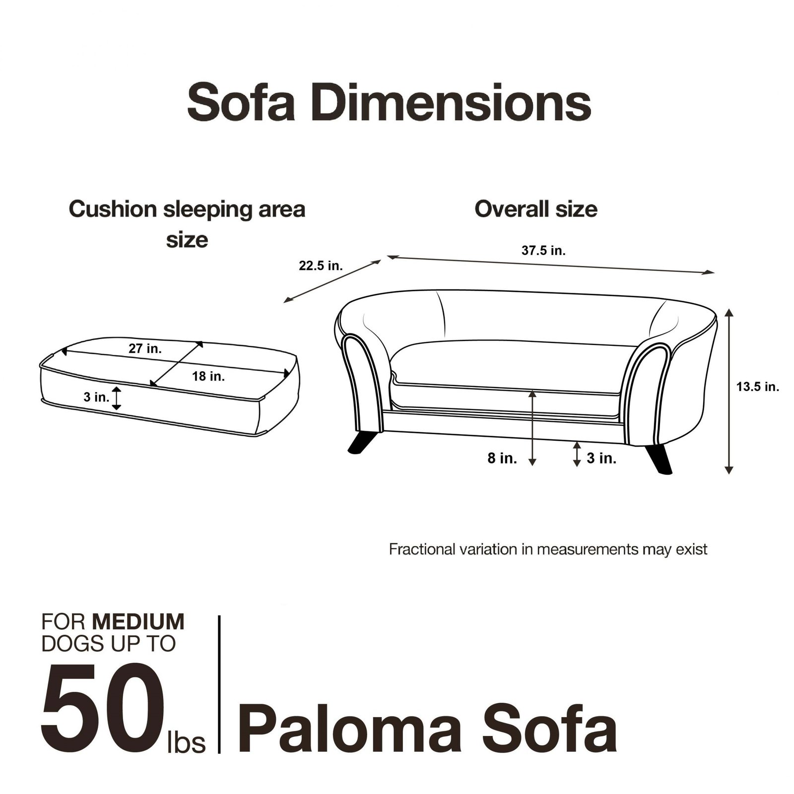 Pet sofa size is 37.5″ x 22.5″ x 13.5″