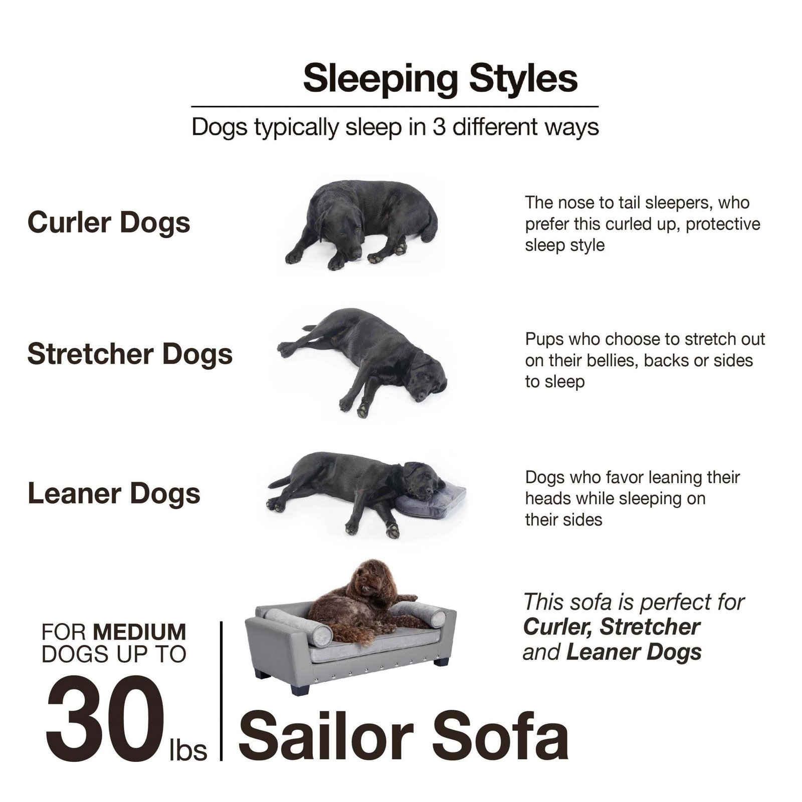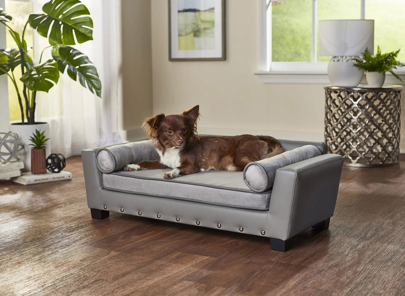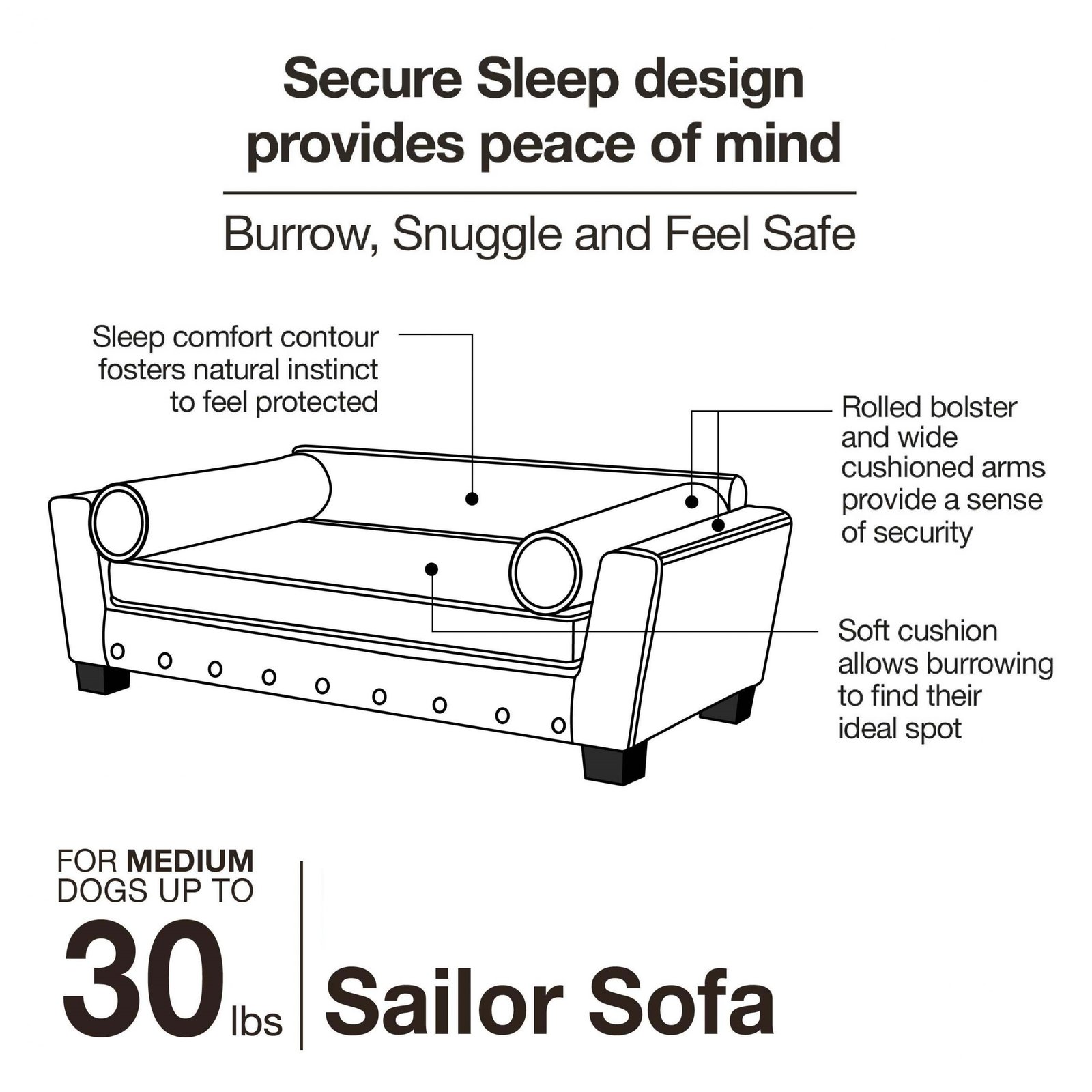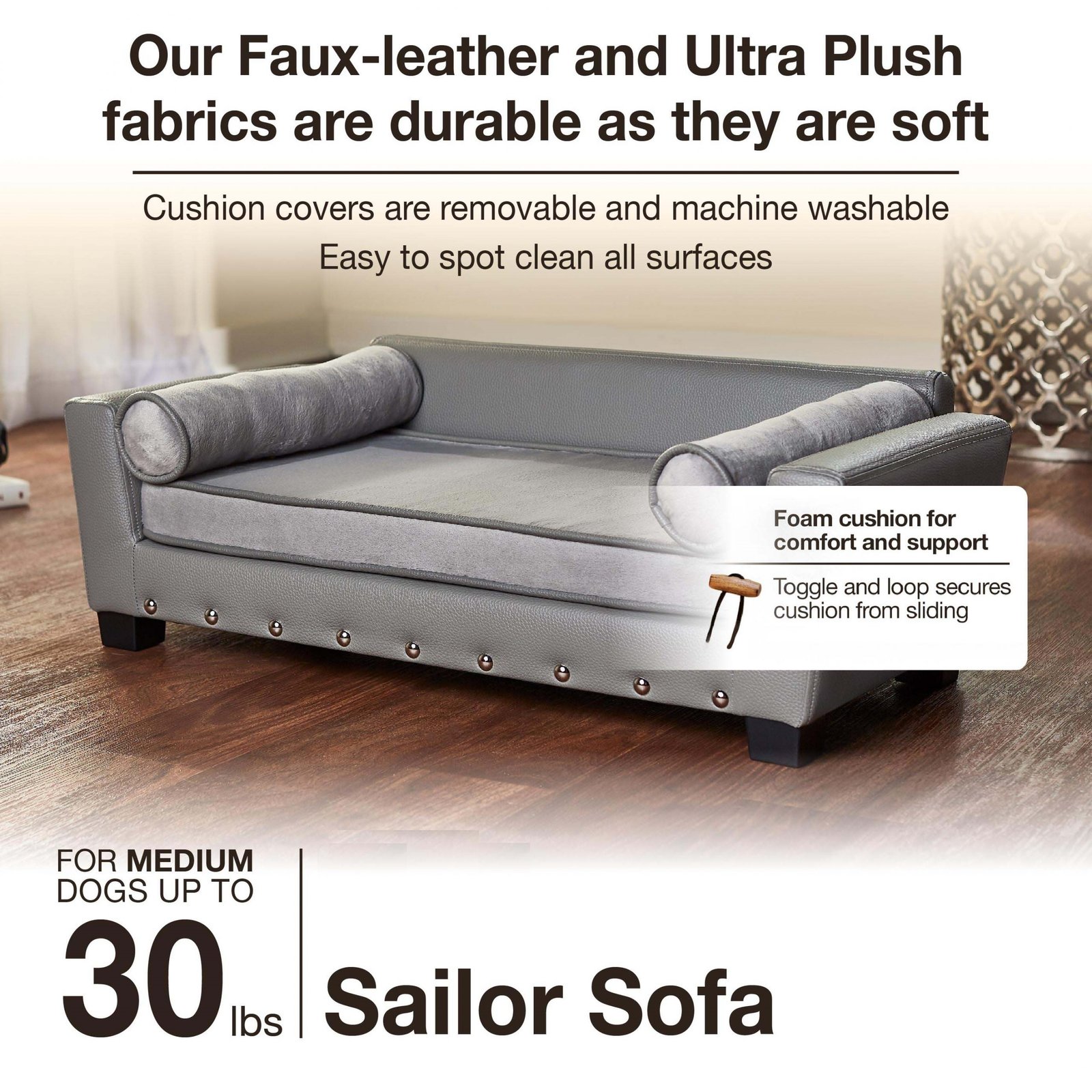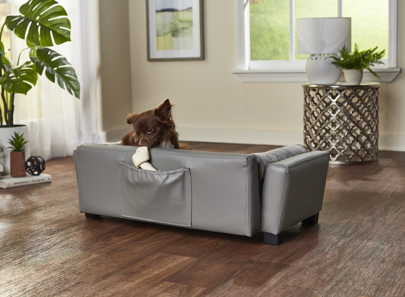 Meet Flea, a 6 pound PomChi, lounging on the Sailor Sofa. This bed evokes a modern story with its clean lines.