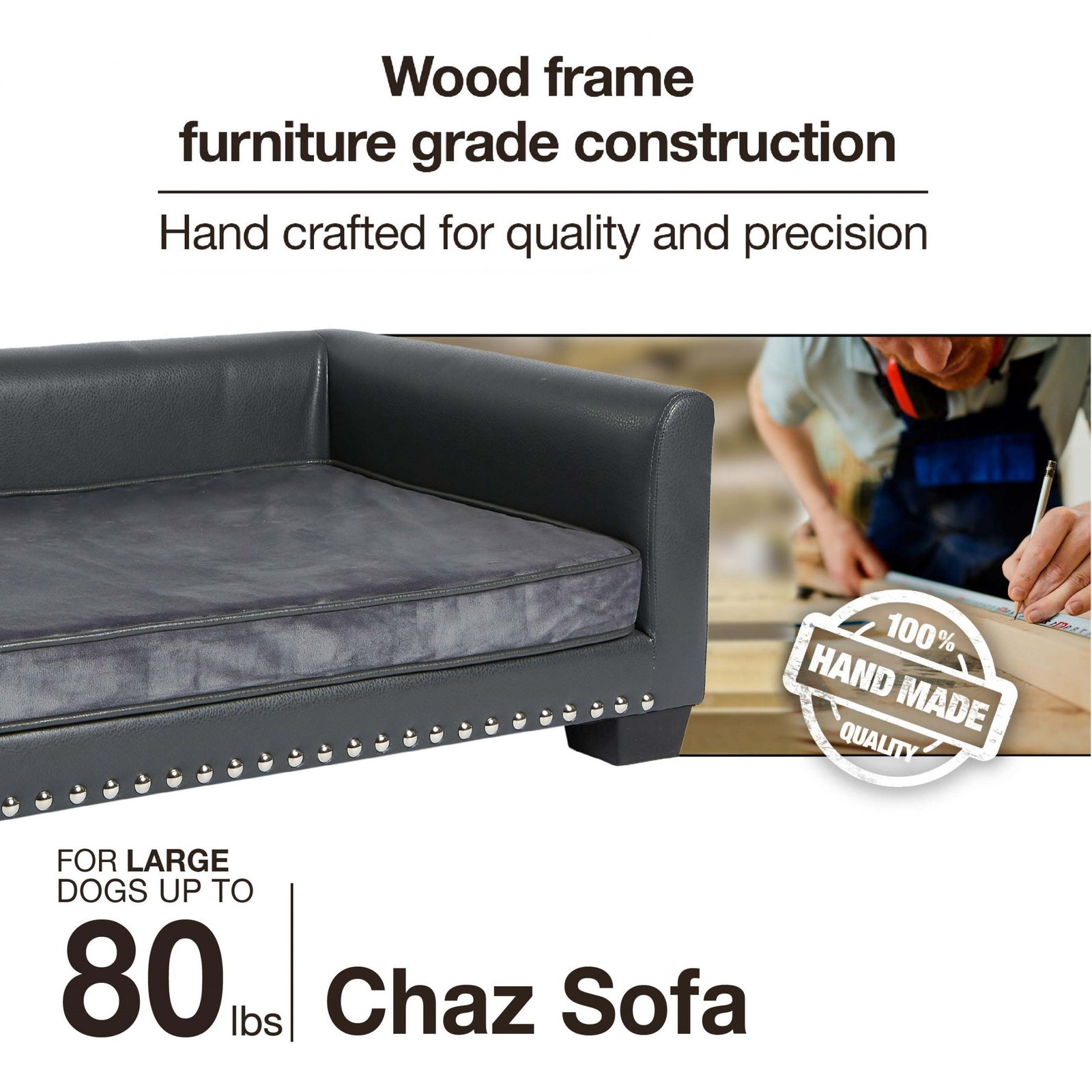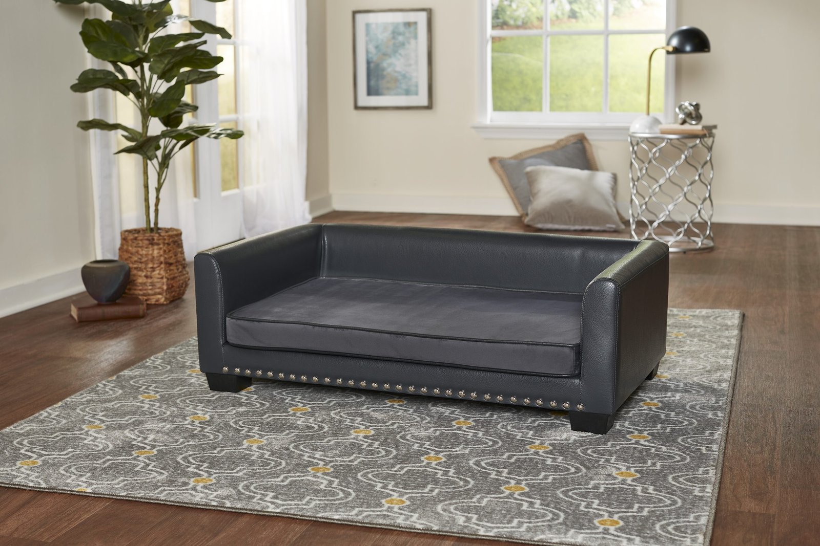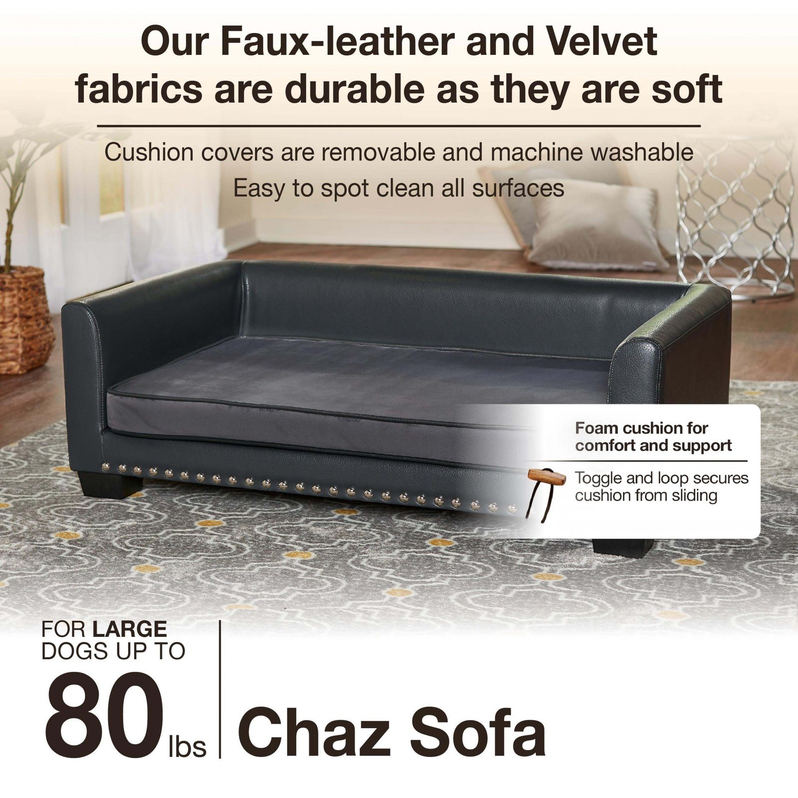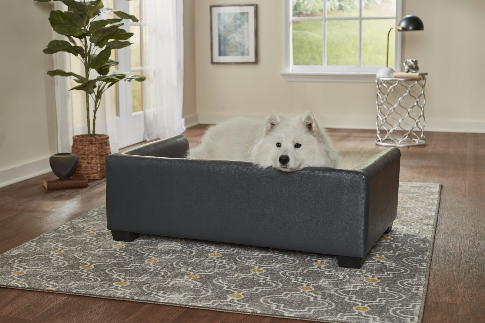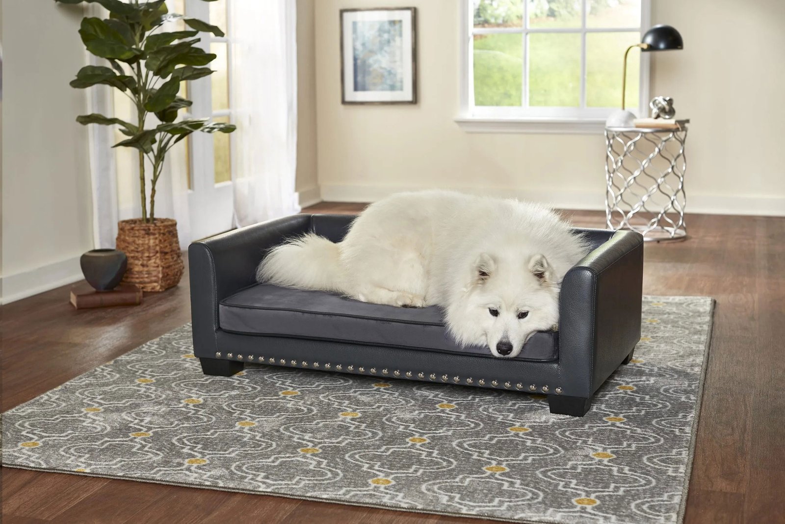 Meet Laylani, a beautiful 60 pound Samoyed, resting on the Chaz Sofa. The clean lines and contrasting grey velvet with grey pebble-grain faux-leather and silver nail-head detail, offer a modern touch with a sturdy feel. The low profile arms and back provide a perfect place for your pet to lean while resting. The seat cushion cover is removable and washable.