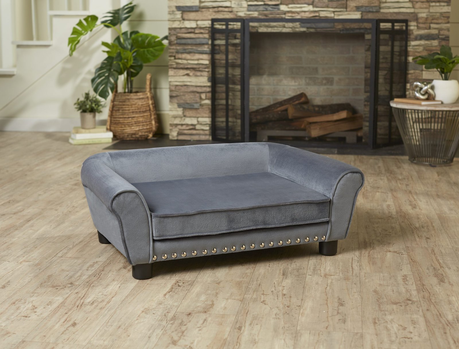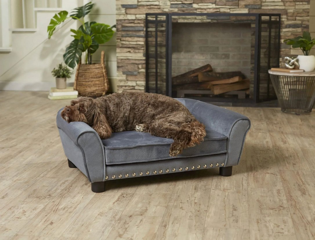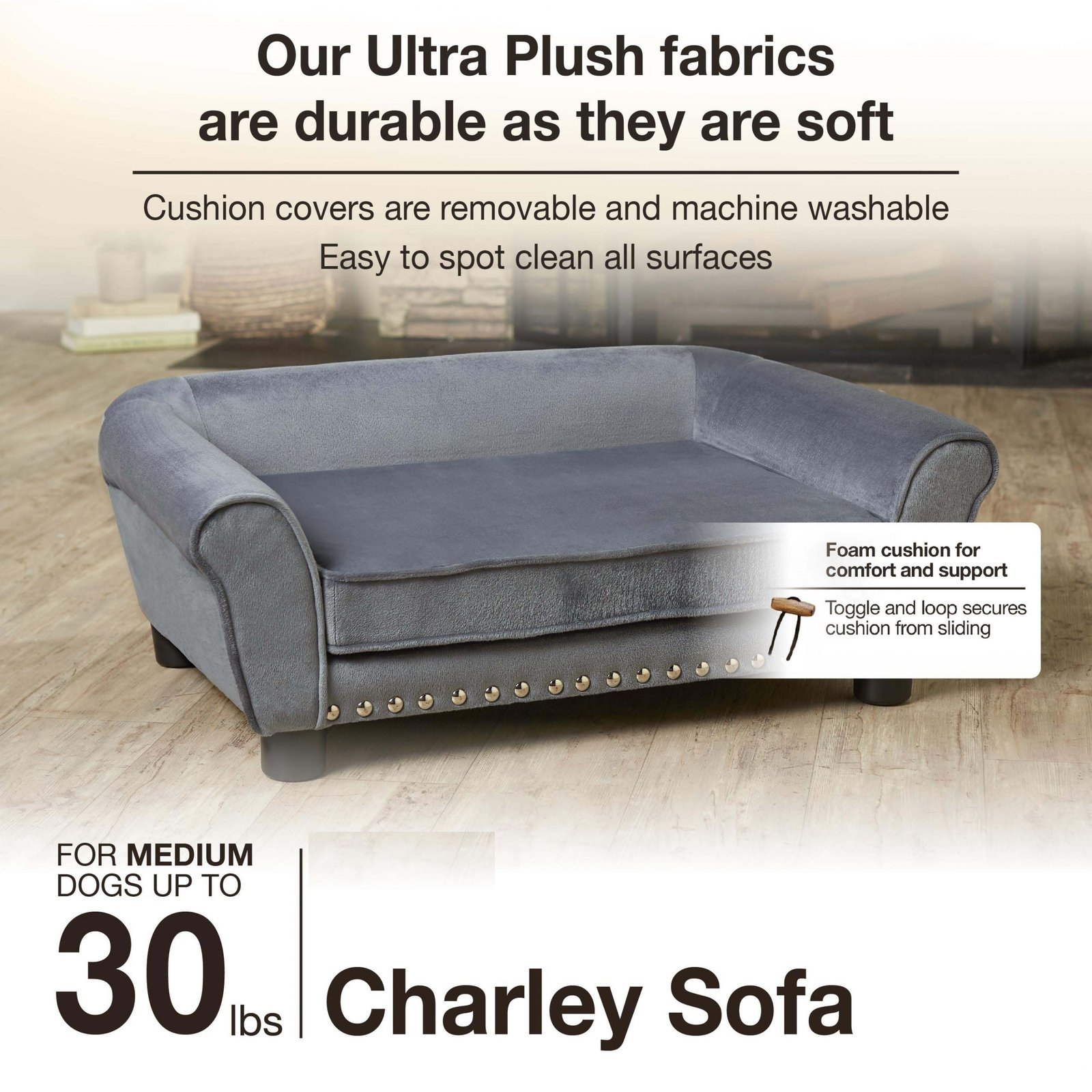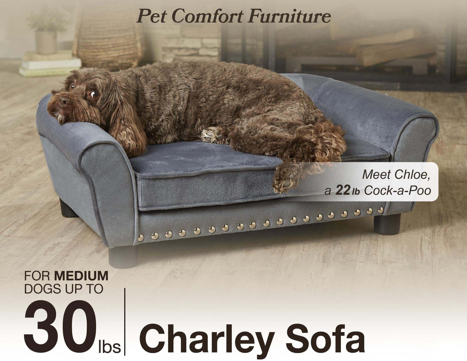 The Charley Sofa, featuring Chloe, a 22 pound Cock-a-Poo, is a mid-sized pet sofa with a classic rolled style arm offering a perfect place for pets who prefer to sleep leaning. Fully upholstered in luxurious deep grey Ultra-Plush with silver nail-heads and made with durable furniture grade construction. The seat cushion is removable and washable.