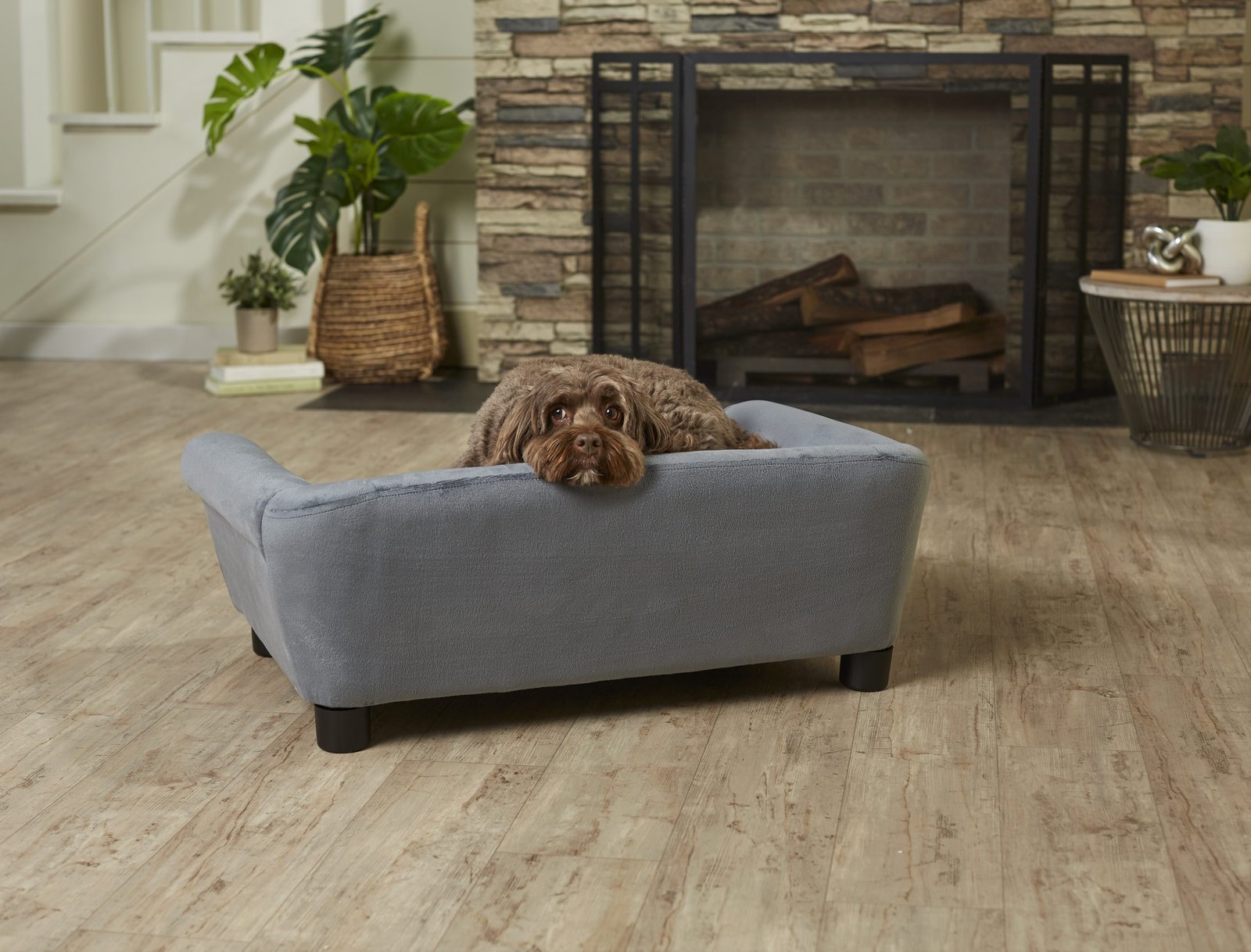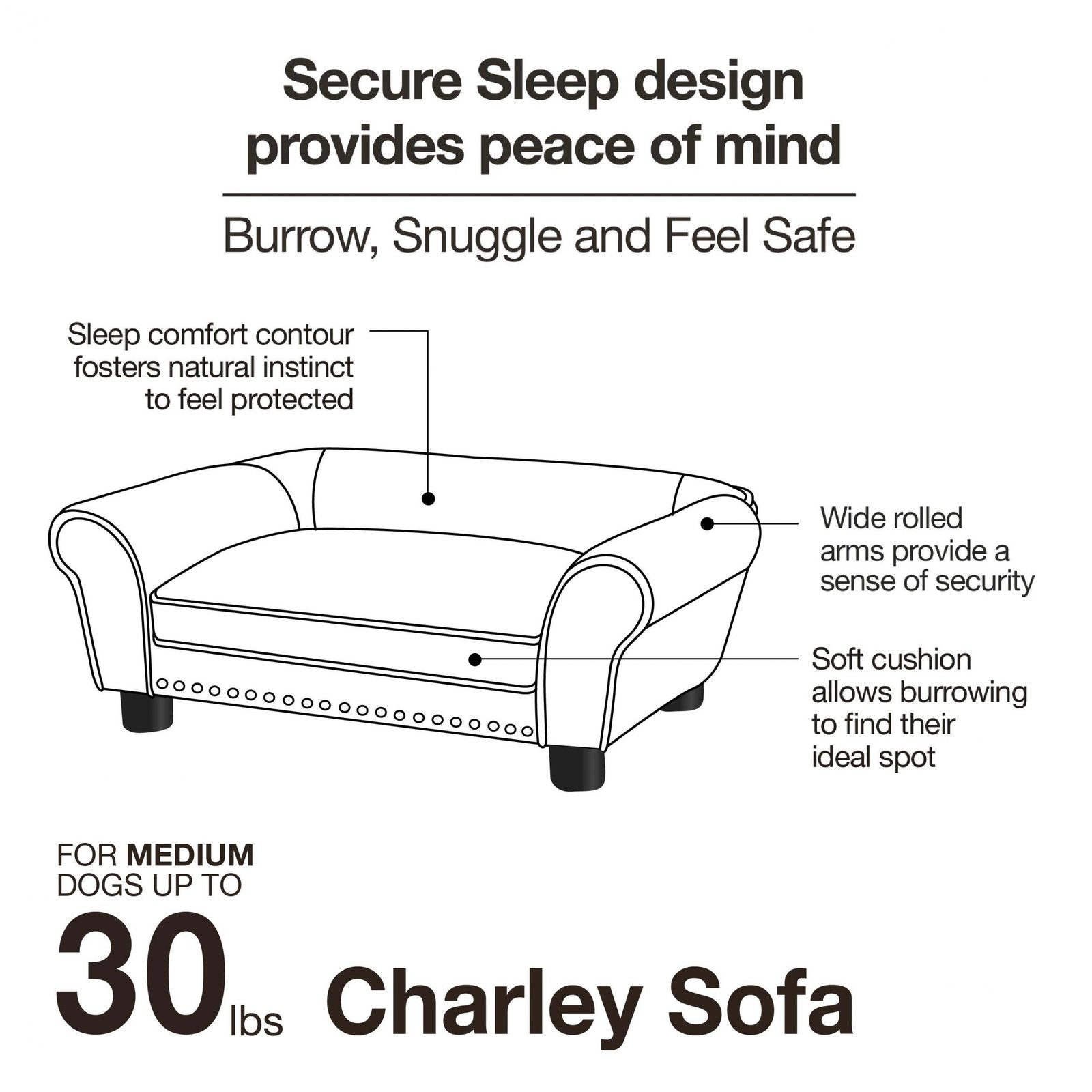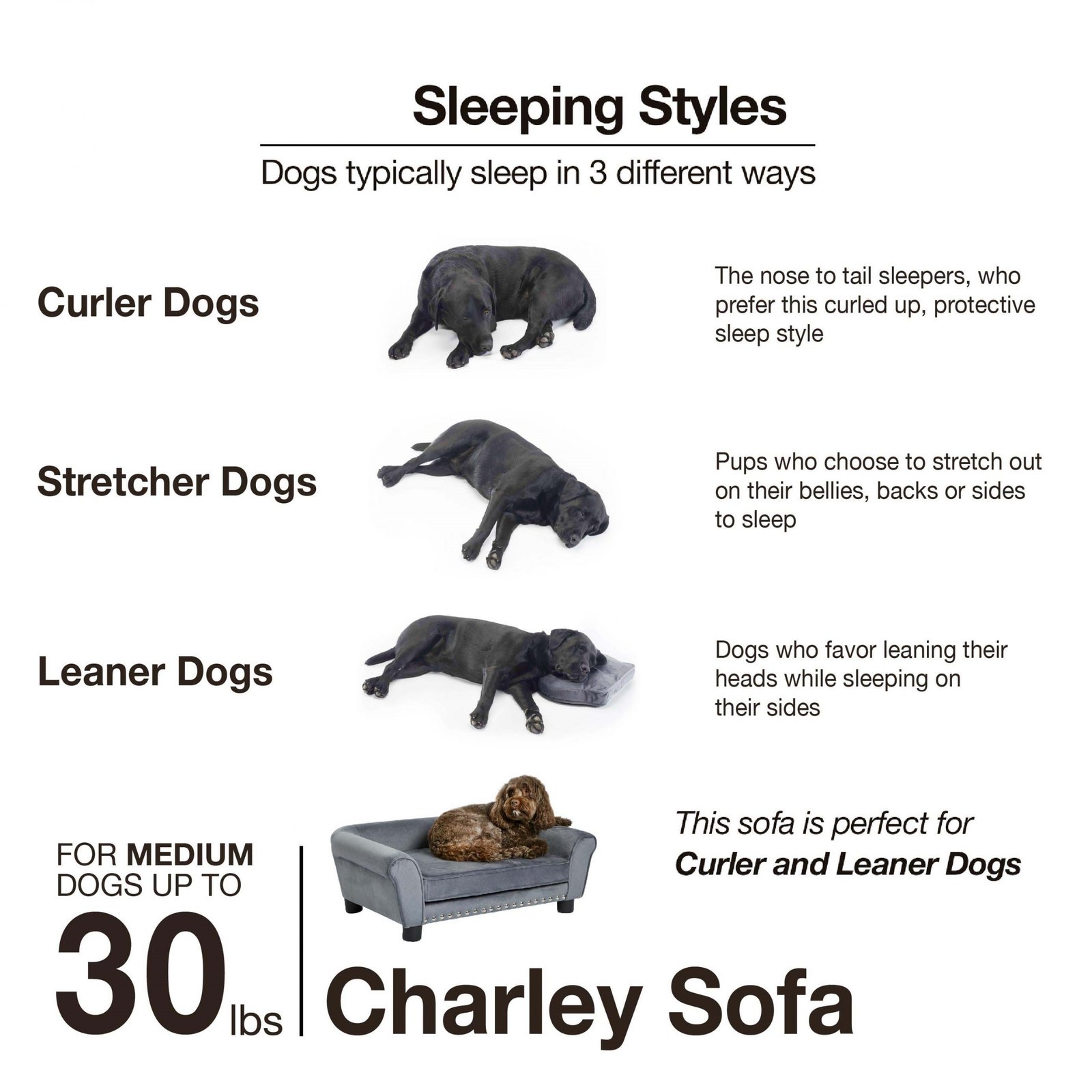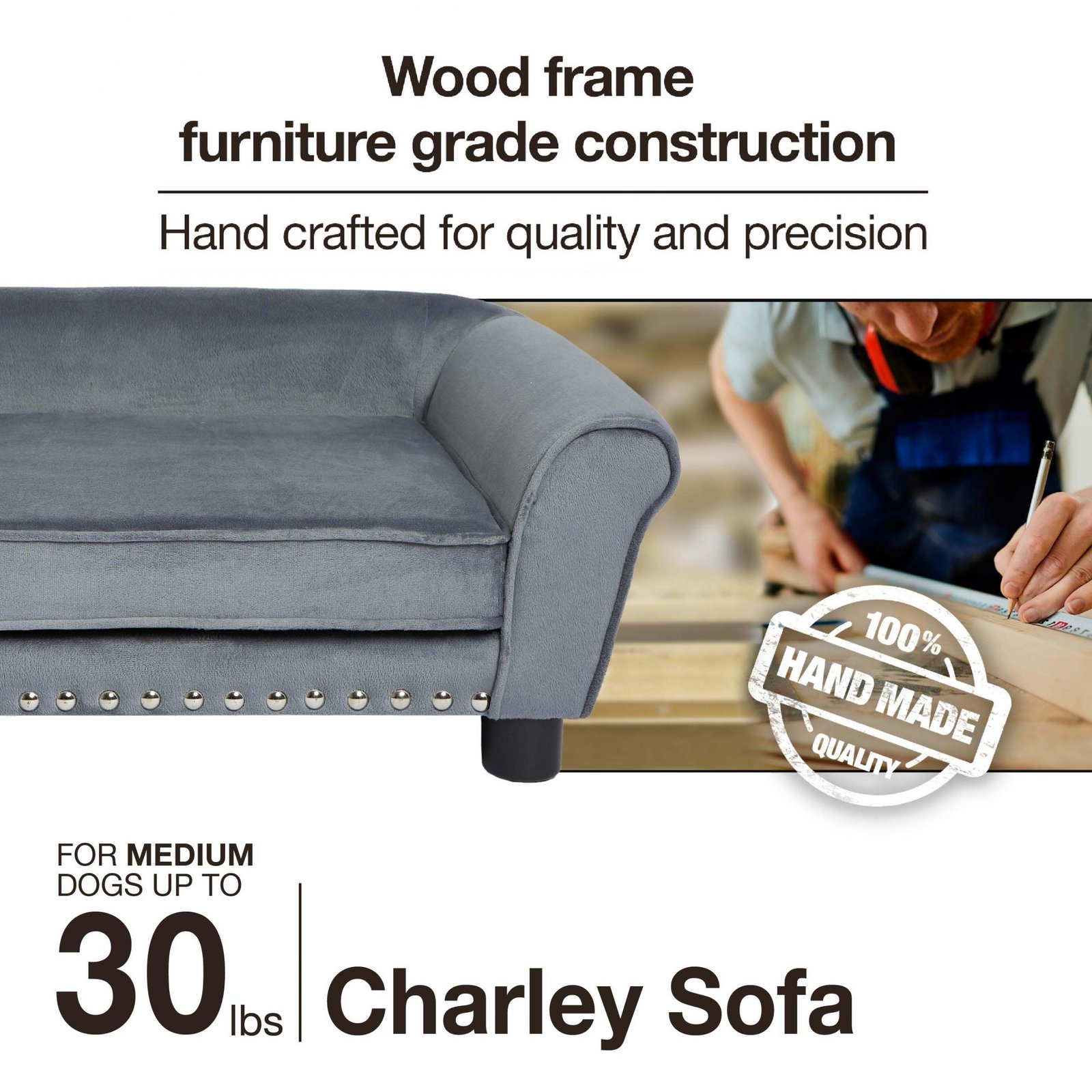 The Charley Sofa, featuring Chloe, a 22 pound Cock-a-Poo, is a mid-sized pet sofa with a classic rolled style arm offering a perfect place for pets who prefer to sleep leaning. Fully upholstered in luxurious deep grey Ultra-Plush with silver nail-heads and made with durable furniture grade construction. The seat cushion is removable and washable.