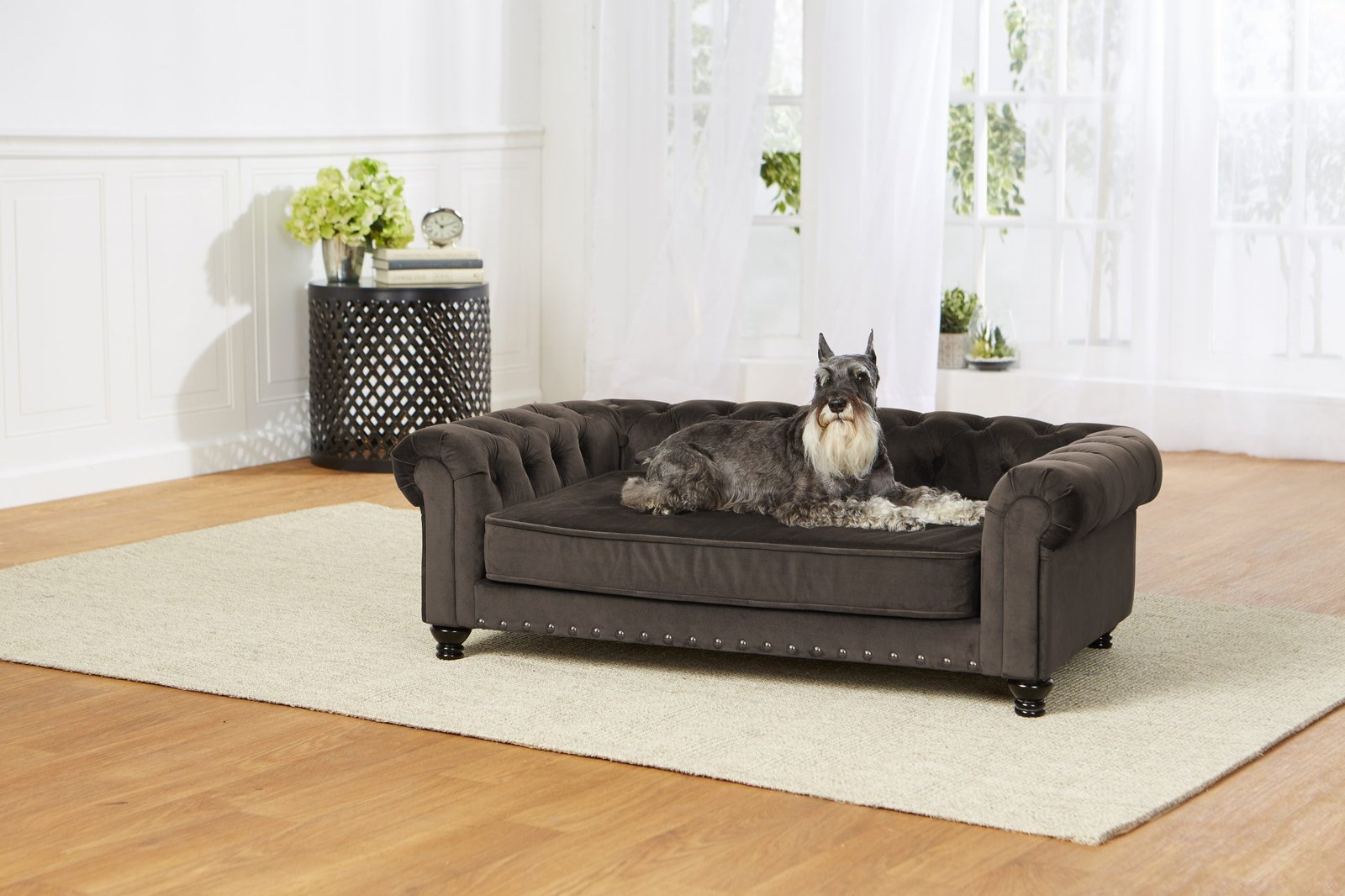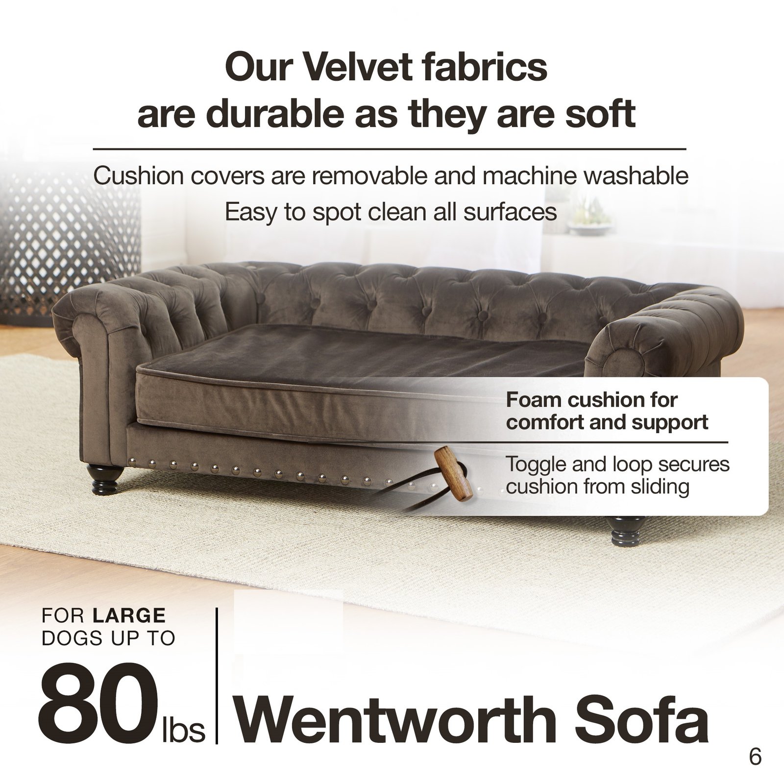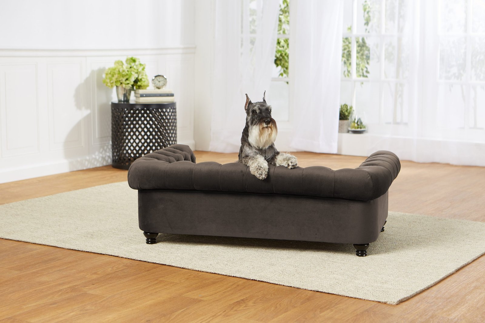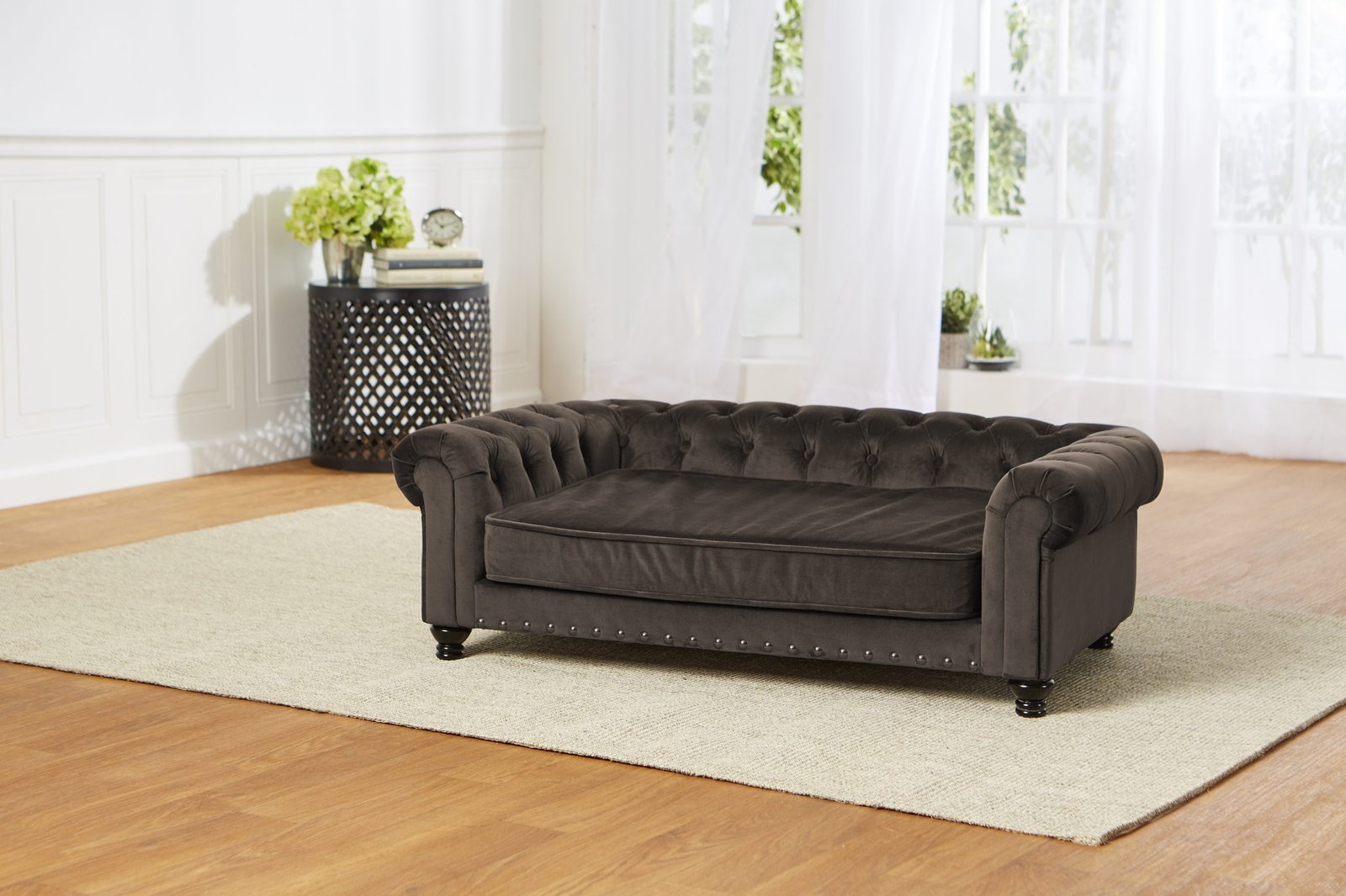 The Wentworth Sofa is a stately, generously tufted pet bed upholstered in charcoal grey velvet.