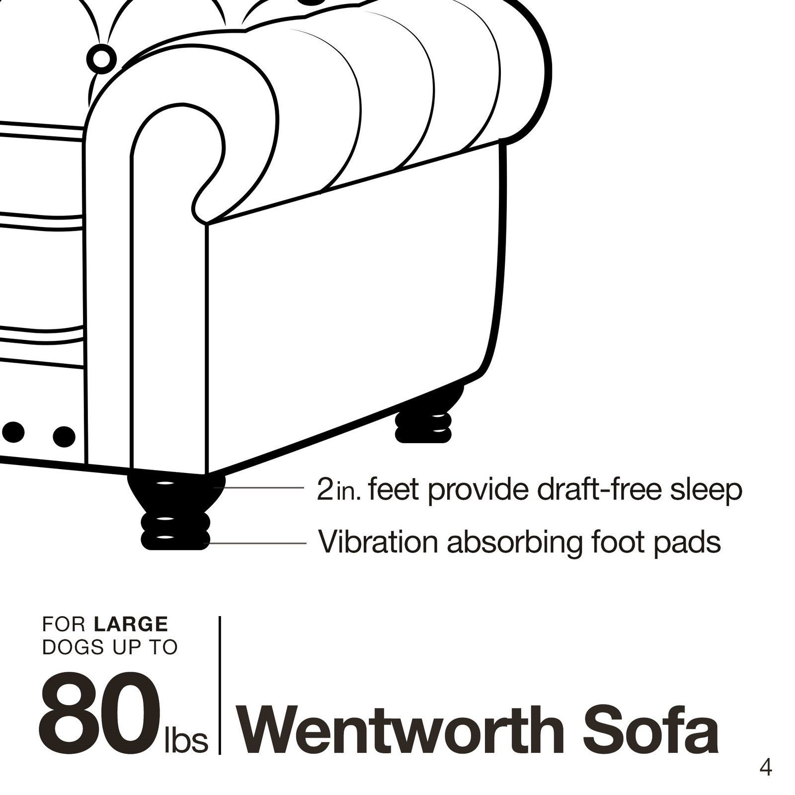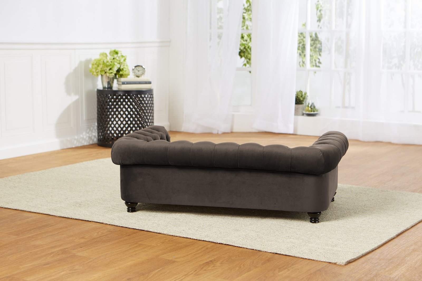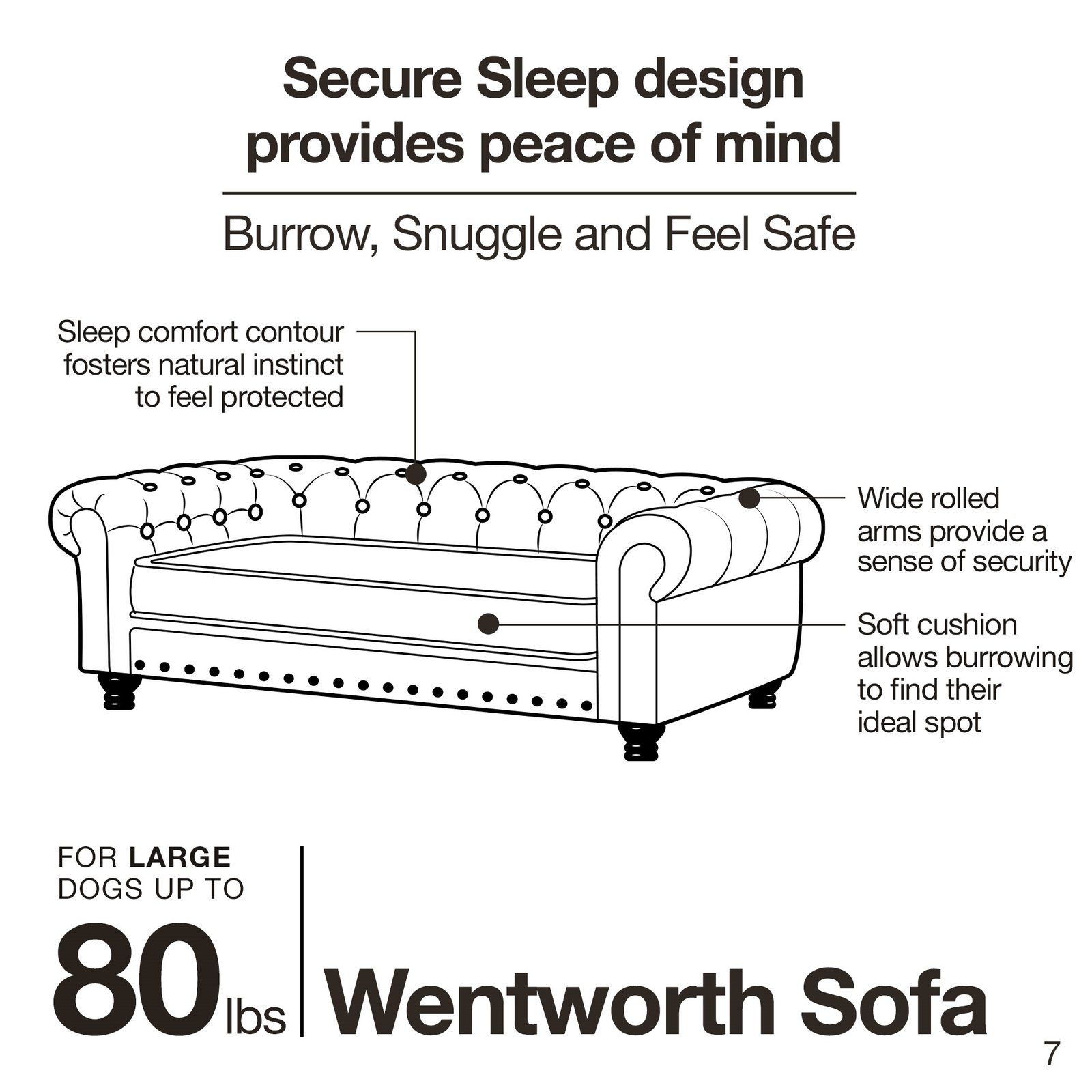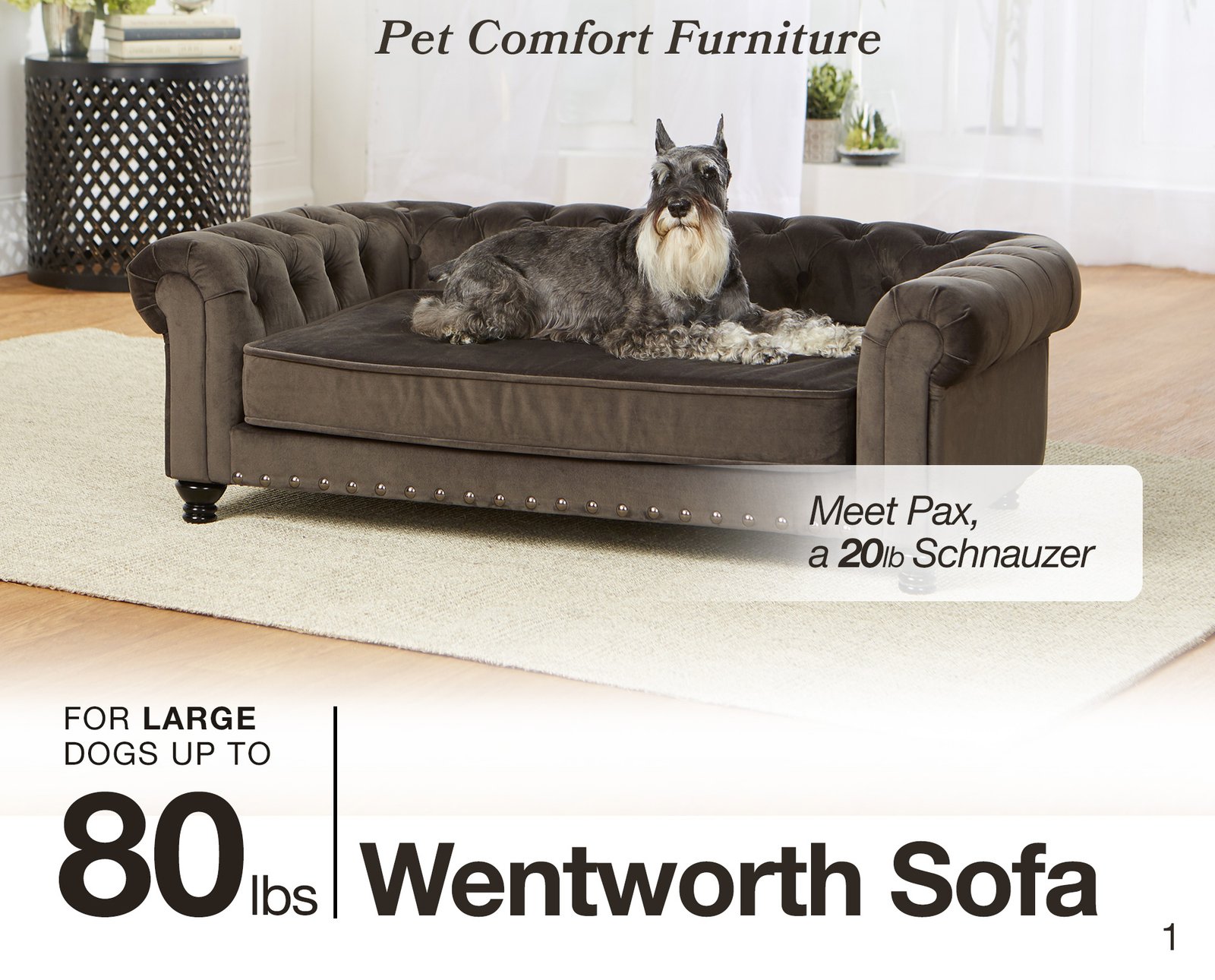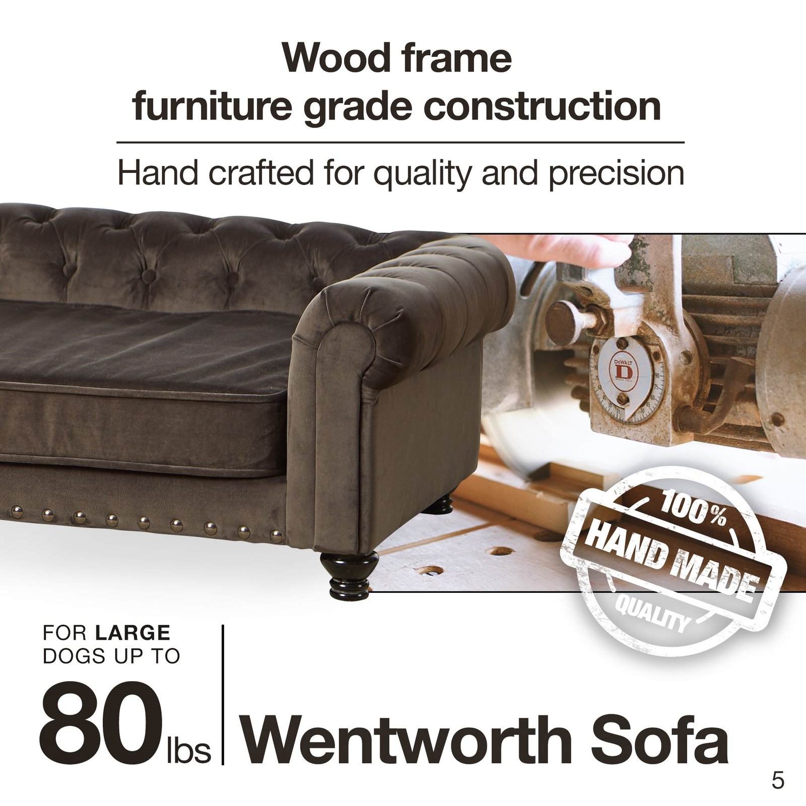 The Wentworth Sofa is a stately, generously tufted pet bed upholstered in charcoal grey velvet.